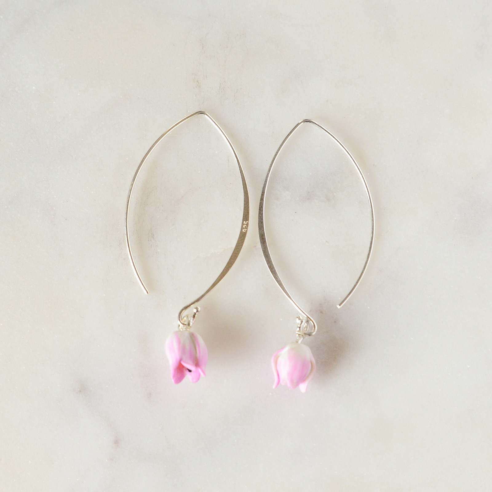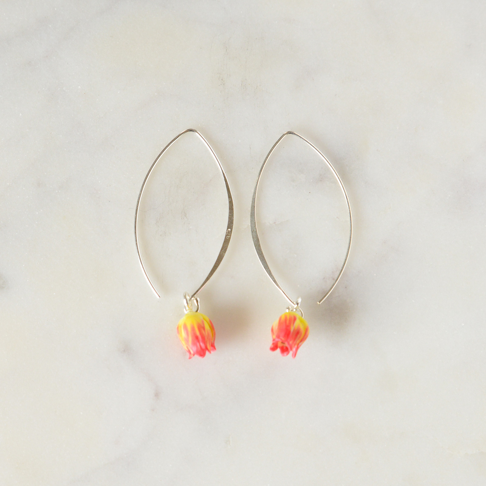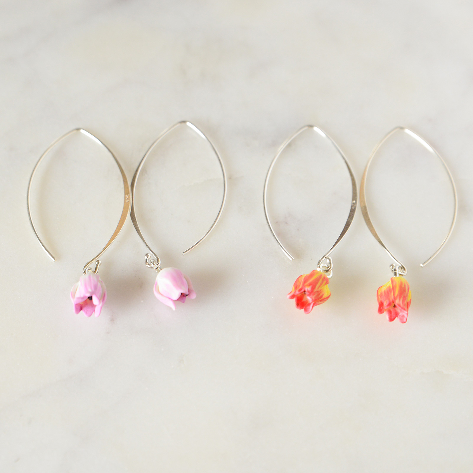 Porcelain two tone tulip sterling silver hook earrings comes into 2 colours pink with white tone or yellow with orange tone.